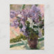 Eine Kunstpostkarte mit dem Impressionistischen Gemälde von Mary Cassatt (1844-1926), einem amerikanischen Künstler mit dem Titel Lilacs in a Window (1880). Ein hübscher Bouquet mit Lavendel-Blume auf einem Fensterbrett.