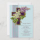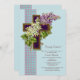 Une belle image d'héritage d'une croix en bois avec le blanc et les lilas de lavande. La croix se repose sur un ruban bleu et rose de contrôle et un arrière - plan bleu. Une invitation religieuse sophistiquée.