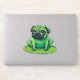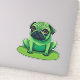 Niedlicher grüner Mops, der einem Frosch ähnelt, der auf einem Lilipad sitzt. Die Hintergrundfarbe kann geändert werden.