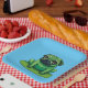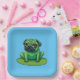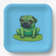 Niedlicher grüner Mops, der einem Frosch ähnelt, der auf einem Lilipad sitzt. Die Hintergrundfarbe kann geändert werden.
