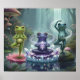 This whimsical poster features three meditative frogs practicing yoga on lotus pads and a crystal pedestal beneath a misty waterfall in an enchanted forest, glowing magic surrounds them.