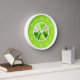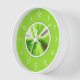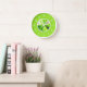 Die runde Wanduhr besticht durch abstrakte Fraktal-Kunst in Grün auf weißem, runden Rahmen und einen limiengrünen Hintergrund mit weißen Ziffern.