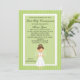 Fangen Sie Ihre Feier mit dieser entzückenden Einladung für die spezielle Mädchen erste heilige Kommunion an. Sie hat ein Limones Grün mit hellgrüner gestreifter Grenze. in der Mitte gibt es eine hellgrüne Mitte mit einer weißen Grenze um sie dort ist ein entzückendes Mädchen, das ein weißes Kommunionskleid mit einem Schleier trägt. Sie hat braunes Haar. Karo heraus die vielen anderen Einzelteile in dieser Linie wie Aufklebern, Porto, danken Sie Ihnen Anmerkungen und mehr.