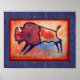 Linda Baysinger Peck's watercolor painting of a stylized buffalo, or bison. Find the hidden face. Blue faux denim border.Image © Linda Baysinger Peck All Rights Reserved