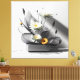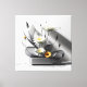 Eine moderne Komposition aus floraler Klarheit und grafischer Spannung: Weiße und gelbe Blüten entfalten sich in einem rechteckigen Gefäß, begleitet von feinen schwarzen Linien, die Blätter und Bewegung andeuten. Der Hintergrund bleibt ruhig und strukturiert, mit subtilen Schatten und geometrischen Akzenten. Die Szene verbindet florale Leichtigkeit mit architektonischer Präzision – ideal für Räume mit Sinn für Design und Tiefe.