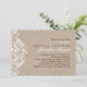 Texture burlap en lin beige avec dentelle vintage blanche élégante, modèle d'invitation à la douche nuptiale. Texte proposé blanc et brun
