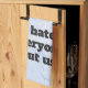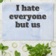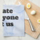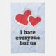 Une serviette de cuisine avec un message noir et tordu de la Saint-Valentin avec une illustration de 2 coeurs en papier rouge et texte typographique qui dit : Je déteste tout le monde sauf nous. Placé sur un arrière - plan en marbre bleu glacé.