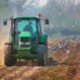 Préparation de la prochaine récolte. Le tracteur charrue (charrue) le champ et les oiseaux sauvages cherchent de la nourriture dans le sol fraîchement retourné. Aquarelle Angleterre. com.