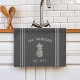 Customisez votre cuisine avec cette mignonne serviette de cuisine personnalisée avec votre nom de famille et l'année établie en lettrage bronzé doux accentué avec une illustration d'ananas sur un arrière - plan gris fusain.