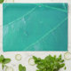 L'oeuvre abstraite de cette serviette de cuisine est une photo originale de ZoeSPEAK d'une feuille de raisin de mer, après une douche légère. Quelques gouttes de pluie peuvent être vues sur la photo closeup, qui montre les veines de la feuille faisant des motifs linéaires parallèles en diagonale à travers le design aqua teinté.