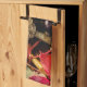 Belle serviette de cuisine avec photo de feuilles d'automne, châtaignes et champignons Photographie de vie morte de champignon parasol (Macrolepiota procera), de grosses châtaignes brunes et feuillage rouge - Feuilles d'automne ou d'automne.