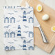 Cute serviette de cuisine illustrée, avec des cabanes de plage et des phares en bord de mer. Motif de plage bleue sur blanc. Idéal pour la maison de plage, cuisine côtière, ou n'importe où avec une plage ou le thème nautique.