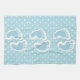 Une serviette avec une image charmante des empreintes de bébé bleu avec un contour blanc épais. Pois blancs sur un arrière - plan bleu bébé derrière l'illustration.