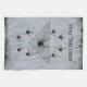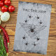 Cette serviette de cuisine est blanc rustique avec des bords noirs avec une toile d'araignée noire triangulaire entourée d'araignées noires avec des pointes rouges en verre d'heure. Customisez votre texte avec le modèle.
