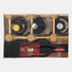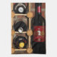 Cette serviette de cuisine comporte un support de vin et une bouteille droite d'ensemble de vin contre un mur de briques. Le plan rapproché crée un motif abstrait intéressant de rouge, de noir, de jaune, de brun et orange.