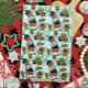 Chats noirs mignons dans ou autour rouge enveloppé un cadeau de Noël vert avec des flocons de neige sur fond bleu clair