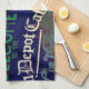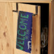 L'oeuvre de cette serviette de cuisine est une photo originale de ZoeSPEAK d'une enseigne et d'une fenêtre de café rustique à l'extérieur du café rural. C'est un panneau coloré peint à la main avec des lettres vertes, blanches et bleues et des notes musicales sur un arrière - plan sombre, dans un cadre en bois. Le panneau est accroché sur un mur en carton jaune pâle avec du rose dans l'ombre, à côté d'une fenêtre avec des stores vert clair accrochés à l'intérieur, et une zone de surbrillance blanche reflétant les branches des arbres.