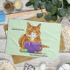 Un mignon chat tabby orange assis devant une tasse de café violet dans un arrière - plan de vert