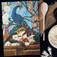 Calico cat jouant avec un dragon chinois rouge devant un vitrail de paon.