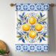 Serviettes de cuisine en carrelage méditerranéen et citrons. Beau bouquet de citron sur un fond de carrelage méditerranéen bleu et blanc. Vous pouvez ajouter du texte pour personnaliser.