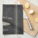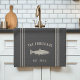 Customisez votre cuisine avec cette serviette personnalisée mignonne portant votre nom de famille ou votre nom de maison et l'année établie en lettrage bronzé doux accentué avec une illustration de poisson sur un arrière - plan gris charbon.