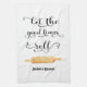 Serviette de cuisine en noir et blanc avec Citation amusante Laissez le bon temps rouler en typographie et en illustration de pin roulant. Personnalisez avec votre propre texte. Cadeau de chauffage domestique, Nouveau Cadeau de maison.