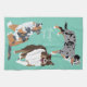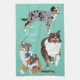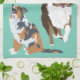Cette serviette de cuisine présente des illustrations de style réaliste de trois bergers australiens ou australiens. Les chiens sont dressés contre un arrière - plan vert menthe. La serviette a un endroit pour ajouter un nom ou un autre texte personnalisé en lettres blanches.