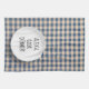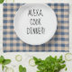 Appareil électronique Alexa commandé pour cuisiner le dîner sur une assiette blanche avec un motif à carreaux bleus.