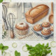 Illustration charmante et détaillée d'une cuisine rustique avec des produits de première nécessité comme un mixer, un tablier et des pâtisseries, évoquant une ambiance chaleureuse et familiale, parfaite pour les amateurs de cuisine.