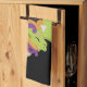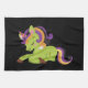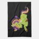 Une serviette de cuisine avec l'image d'une licorne de style Frankenstein. Couleurs violettes et vertes. Éffrayant mignon.