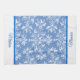 Une serviette de cuisine avec un motif damassé élégant de marguerites vintages et feuilles avec des rouleaux en blanc sur le bleu de cornflower, avec une bordure de blanc avec de l'espace pour votre nom en bleu.