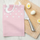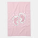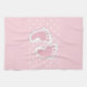 Serviette de cuisine avec une adorable image d'empreintes de filles roses avec un contour blanc épais. Pois blancs sur un arrière - plan rose derrière l'illustration.
