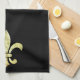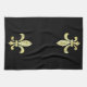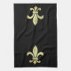 16" x 24" serviette de cuisine noire avec une image sur les deux extrémités d'une feuille d'or fleur de lis. Serviette assortie de tissu See, serviette de papier de cocktail, set de table de tissu, set de table de papier et dessous de verre. Voyez la collection entière de serviette de cuisine de cancan dans la section de toiles de FOOD/BEV |.