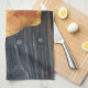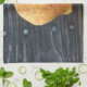 Sur cette serviette de cuisine est une photo originale de ZoeSPEAK d'une feuille de raisin de mer, tombée d'un buisson sur les planches en bois d'un pont, aidé le long de son chemin par une douche de l'après-midi. Le grain du bois brille dans la moiteur, et les ongles brillent comme des marques d'accent. Les couleurs jaune et orange de la feuille se détachent de l'arrière - plan foncé, accentué par une goutte de peinture d'aqua au bord inférieur.