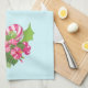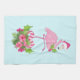 Serviette de cuisine avec flamant de Noël à thème tropical portant un chapeau de santa rose. Sous ses pieds se trouve un bouquet de sucre de canne avec de jolies fleurs tropicales et des baies roses. Un bourgeon de saint sur sa poitrine.
