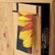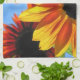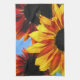 Éclairer votre journée avec cette serviette à main magnifique.Trois tournesols de couleur brillante brillent dans le rétroéclairage éclairé par la lumière du soleil qui traverse les pétales. Les fleurs présentent une palette d'or, jaune, orange, rouge et marron. Le ciel bleu complète cette composition abstraite de couleur et de forme.
