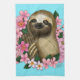 Un mignon paresseux assis au milieu de fleurs roses sur un fond bleu