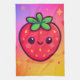 Ce design adorable se compose d'une fraise de style dessin animé avec un visage joyeux, des joues roses et des yeux expressifs. La fraise est surmontée de feuilles verts vibrants et parsemée de graines jaunes, dressée contre un arrière - plan de dégradé rêveur qui passe du rose tendre au violet et au jaune. Les coeurs, les étoiles et les points éparpillés ajoutent une atmosphère fantaisiste et ludique, rendant la composition globale douce et visuellement délicieuse.