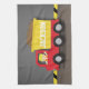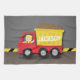 Caractéristiques de conception un petit garçon mignon de constructeur dans un casquette de sécurité et un gilet orange conduisant un camion à benne basculante rouge. La conception est traitée avec un effet d'ombre qui fait le bruit de conception. Un motif incliné jaune et noir de rayures à l'arrière-plan qui est généralement trouvé dans des zones et des sites de construction grands pour les garçons qui aiment des véhicules de construction et des jouets de camion ! Personnalisez avec le nom de l'enfant pour le rendre extra spécial !