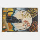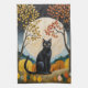 Cette oeuvre d'art fantaisiste et sereine présente un chat noir frappant comme figure centrale, assis au sommet et majestueux dans un paysage automnal stylisé. Derrière le chat, une immense et lumineuse pleine lune domine la scène, projetant une douce lueur sur des collines et un ciel sombre et étoilé. Les arbres environnants sont ornés de feuilles dynamiques et stylisés dans une palette chaleureuse de jaune, d'or et d'orange brûlé, qui contraste magnifiquement avec les tons cool de l'arrière - plan. L'oeuvre mêle un sens du réalisme magique à une esthétique d'art populaire, créant une scène captivante et tranquille remplie de charme mystique.