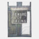 Un design artistique de la vieille porte du bureau de réservation sur la plate-forme de la gare avec un avertissement de non entrée et de se méfier des trains de l'époque du train à vapeur.