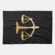 Serviette de cuisine avec une image de balance dorée sur un arrière - plan noir. Simple et élégant.