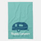 Une serviette de cuisine gaie, parfaite pour votre camping-car ou votre véhicule routier. Montré avec un modèle de campeurs turquoise arrière - plan et bleu marine avec la phrase "Happy Campers". Customisez votre nom de famille pour en faire une sorte. La couleur Arrière - plan peut également être changée pour correspondre à votre décoration et vos préférences.