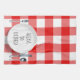 Commande Alexa électronique pour faire la vaisselle sur une assiette blanche avec argenterie. L'Arrière - plan est rouge et blanc de buffle plaid