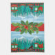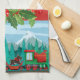 Joyeux train de Noël avec un petit Chien écossais à cheval sur cette serviette de cuisine de vacances avec arrière - plan rouge.
