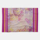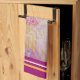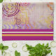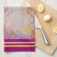 Serviette de cuisine de 16" x 24" avec l'image d'un design complexe avec des cercles, des points et des flèches violets, roses, orange et jaunes. Bordures à bandes de prune, tan et jaune. Voir la serviette en tissu assortie, la serviette en papier, le set de table en tissu, le set de table en papier et les dessous de verre. Voir l'ensemble de la collection de serviettes de cuisine des Lumières dans la NOURRITURE/VRE | Section Linge.