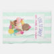 Une serviette de cuisine avec une citation amusante avec l'illustration d'une crème glacée à 3 scoops ensoleillée avec des arrosages colorés. Un cône glacé avec des boules de chocolat, fraise et vanille. Un bol de glace néopolite avec une cerise sur le dessus. Des fraises et un ananas sont assis à côté des bols. Motif à rayures vert et blanc à la menthe en arrière - plan.