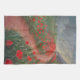 Un sentier sinueux avec des pavots rouges vibrants mène à travers une campagne verdoyante sous un ciel nuageux.