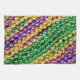 Serviette de cuisine de 16" x 24" avec une image festive de colliers de perles de Mardi Gras violets, verts et dorés. Voir serviettes assorties, serviettes en papier, set de table en tissu, set de table en papier et dessous de verre. Voir toute la collection de serviettes de cuisine Mardi Gras dans le FOOD/BEV| Section Linens.