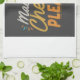 Un design coloré et ludique avec le texte "Mac et fromage s'il vous plaît" dans une police audacieuse et ludique, dégoulinant de fromage fondu et saupoudrée de chapelure. Le design est entouré de tourbillons de fromage et de nouilles de macaroni, créant un accessoire de cuisine amusant et fantaisiste.